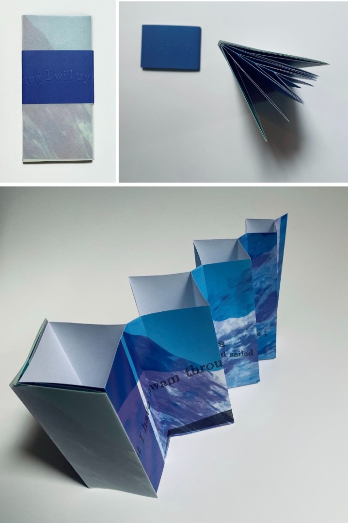 Laser photocopy on various papers, hand-embossed title on belly band, fishbone/tree binding