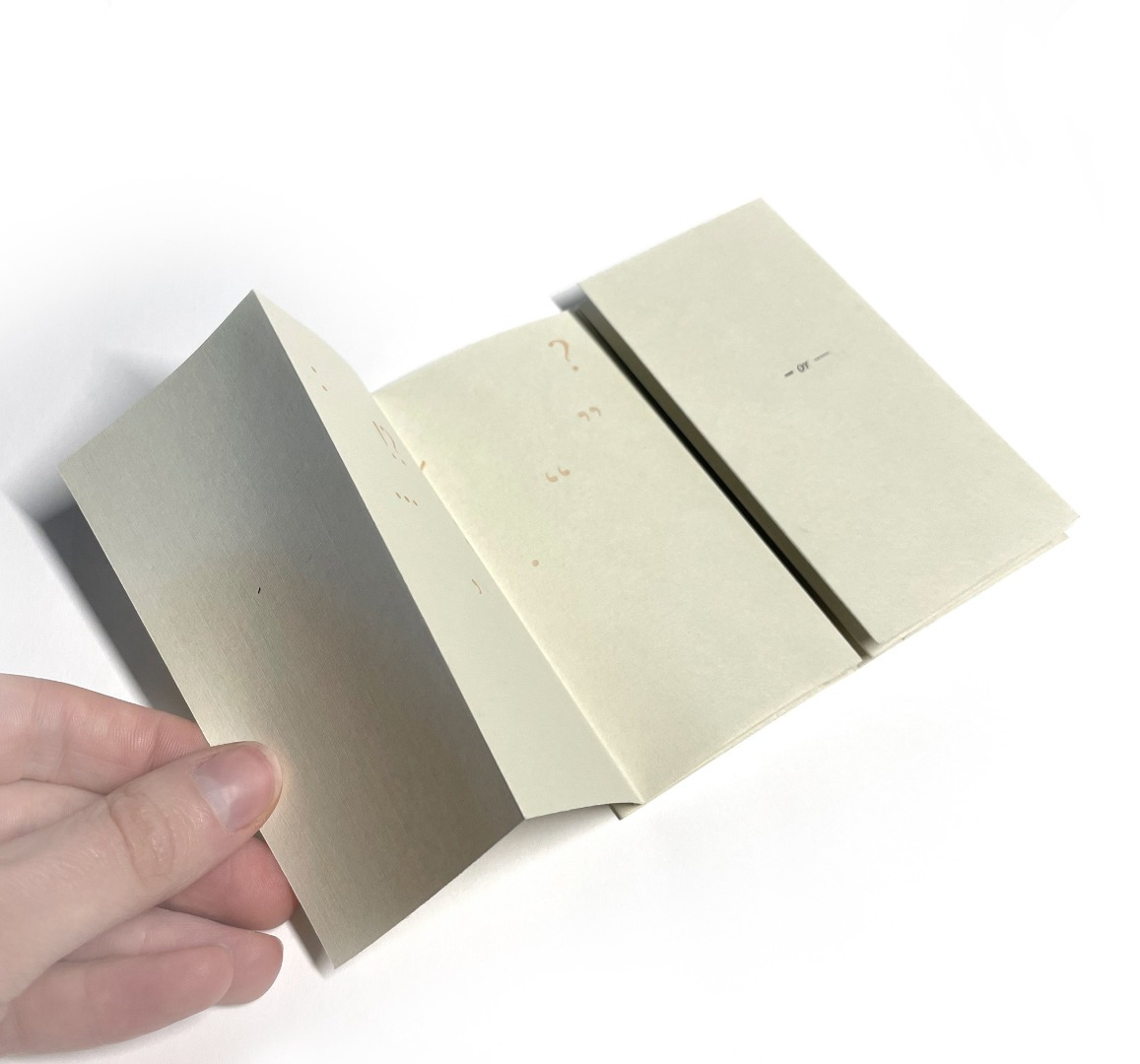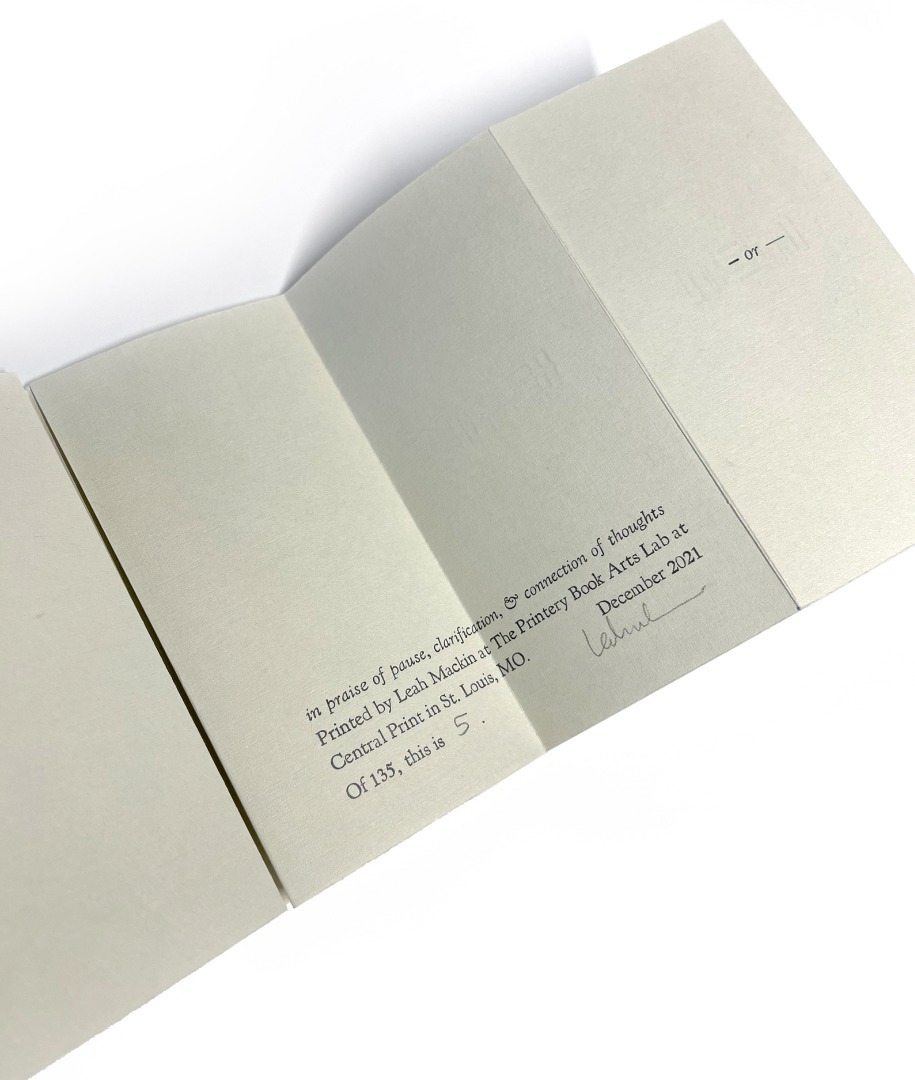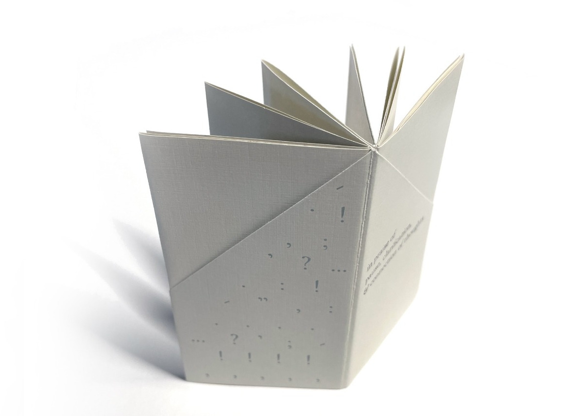 A small collection and celebration of the fourteen punctuation marks used in the English language: period, question mark, exclamation point, semicolon, colon, comma, hyphen, dash, brackets, braces, parentheses, apostrophe, quotation mark, and ellipsis. Letterpress printed from handset metal type at The Printery Book Arts Lab at Central Print in St. Louis, MO. in December 2021.